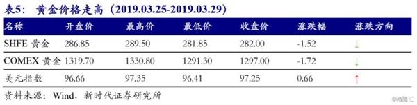 上周国内国际黄金价格走势一致,SHFE黄金价格下行1.52%,收于282.00元/克;COMEX黄金价格下行1.72%,收于1297.00美元/盎司。虽然美国经济出现放缓迹象,但整体来看仍然强于其他国家(例如欧洲),叠加英国脱欧不确定性增强,支撑美元指数,美元指数的走强令金价承压回落。