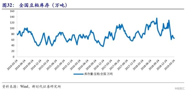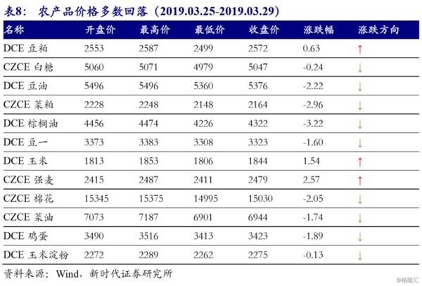 上周,农产品期货价格多数回落。DCE豆粕期货价格上周上行0.63%,收至2572元/吨。豆粕库存持续去化,利多豆粕价格。截至3月24日,全国豆粕库存回落至65.35万吨。南美收割推进提振全球供应,巴西18/19年度收割进度已完成70%。