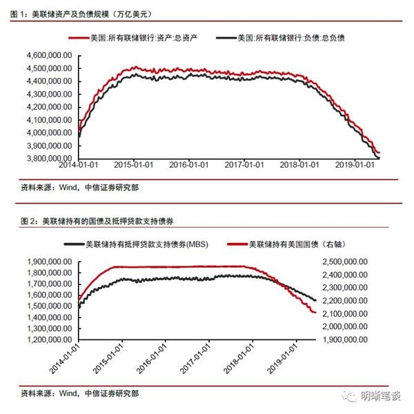 回顾美联储的缩表进程:美联储在2017年6月的议息会议上声明,于2017年开启缩表,同年9月议息会议中,宣布2017年10月起启动渐进式被动缩表,时任美联储主席耶伦称若经济遭遇重大负面冲击、经济前景实质性恶化,使得降息不足以提供刺激,美联储可能会停止被动缩表(Roll-Off),甚至重新启动到期资产再投资计划。