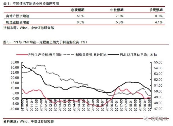 值得注意的是,上述测算仅仅考虑房地产投资对制造业投资的影响,并未考虑其他的外生变量对制造业的影响。当前工业通缩(盈利未稳)、制造业PMI走弱、外贸环境的不确定性以及发改委下半年继续推进部分行业产能去化都可能影响制造业投资增速。综合考虑上述因素,我们将全年制造业投资增速区间下调至2.5%-5.0%。