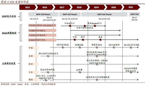 1)标准:作为行业发展基础,3GPP的全球标准工作正在持续推进,规划于2020年R16中引入5G-V2X.2)政策:不同于美欧日韩等主要国家在技术标准上的徘徊,中国在标准、政策等顶层设计领域先行,较早地确立C-V2X的技术路线,并于2018年11月发放LTE-V2X专用频谱。3)试验:目前我国处于试验阶段,并计划于2020年实现商用。工信部提出短期目标2020年车联网用户渗透率达到30%,联网车载终端的新车装配率达到60%以上。