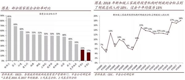 国企分红有助于增加公共财政的收入来源,缓解财政收支压力。例如2018年新加坡三家政府投资机构对财政的分红相当于多贡献了3.3个百分点GDP规模的财政开支,占到了财政总收入的18%,过去十年均值为13%,是新加坡财政收入的重要来源。如果我国国企实际分红率提升至30%的2020目标,可以增加0.5个百分点GDP规模的财政开支或者税费减免;如果提升至国际普遍水平50%,这一比例将升至1.2个百分点。