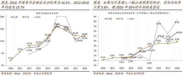 自2007年国企利润上交重启以来,央企上交利润比例有过三次上调,当前法定比例仍然低于30%,而地方国企利润上交比例一直都未有明确。2007年,财政部、国资委规定中央企业上交不同比例的利润,不同行业分为10%、5%、暂缓3年上交或者免缴。2010年,中央决定适当提高中央企业国有资本收益收取比例,不同行业分为15%、10%、5%或者免缴共四档。2012年起划分成五档,中国烟草总公司单独成一档,税后利润征缴比例从15%上升至20%。2014年再次提高征缴比例5个百分点,不同行业分成25%(烟草总公司)、20%、15%、10%和免交(中储粮棉),这一法定比例相比30%的目标仍有差距。