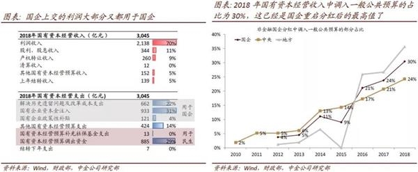 2007年9月,国务院发布《关于试行国有资本经营预算的意见》,随后配套意见相继发布,标志着我国国有资本经营预算的初步建立,国有企业上交利润重启。然而,国企上交的利润大部分又都用于国企,包括解决历史遗留问题及改革成本支出、国有企业资本金注入、国有企业政策性补贴等。2018年国有资本经营收入约2900亿元,其中调入一般公共预算的只有885亿元,占比30%,而这已经是国企重启分红后的最高值了,2012年这一比例只有4%,2016年跳升至21%,2018年升至30%,主要是因为地方国企在这三年显著提高了国有资本经营收入调入公共财政的比例,央企的这一比例在这期间保持匀速上升。