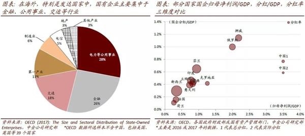 相比中国,国有经济在对比国家中的占比要小得多,这与我国以公有制经济为主体的基本经济制度有关。在海外,特别是发达国家中,经历了数轮大规模的改革和私有化后,国有企业逐渐从一些市场化、竞争性的领域退出,主要集中于金融、、交运等行业。例如研究对象中分红率最高的新西兰,其国资占GDP的比例只有6.1%,分红率第二的芬兰该比例为6.9%;国企分红占GDP比例最高的挪威,其国资占GDP的比例为23.7%。而在中国,2017年国有资本总额87万亿,是GDP的1.1倍。因此以国企归母净利润占一国GDP的比例进行横向对比:中国无疑是占比最高的国家,达到3.5%;其次是挪威、俄罗斯、克罗地亚等国家,占比超过1%;占比较小的是新西兰、法国、荷兰等国,这一比例在0.3%左右。