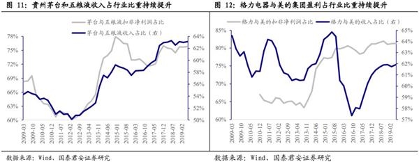 白酒行业与的收入占行业比重持续上升。我们计算了与2家白酒行业头部公司的营业收入TTM和扣非净利润TTM占A股有近10年季度财务数据的可比白酒公司的比重。2家头部公司的营业收入TTM占行业比重从2009年第一季度的54.35%稳步上升至2019年第二季度的63.12%,而同期扣非净利润TTM占比从68.33%升至75.79%。2012年以来行业集中度开始快速提升,在行业景气度较低的2014年第四季度,2家头部公司扣非净利润占比一度达77.93%,在行业部分公司陷入时,头部公司有更强的盈利韧性。