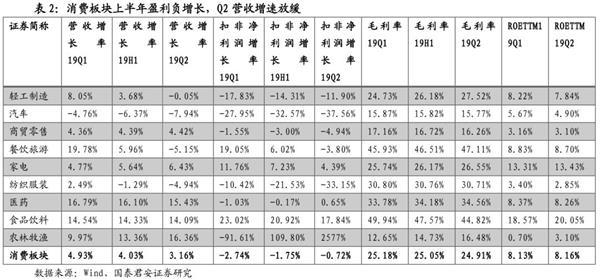 消费板块上半年盈利负增长但韧性较强,Q2农业、、盈利增速较高。我们将、家电、汽车、轻工制造、、商贸零售、医药、餐饮旅游、农林牧渔等产品需求与终端消费景气度相关性较高的行业归为消费板块。2019年上半年消费板块营业收入同比(整体法)增长4.03%,Q2增长3.16%,增速较Q1放缓1.77个百分点。消费板块2019年上半年净利润同比下滑1.75%,Q2下滑0.72%,降幅较Q1收窄2.02个百分点。消费板块Q2毛利率较Q1略有下滑,ROE仍维持在8%以上,盈利韧性较强。分行业看,Q2农业、、盈利增速较高,汽车、、轻工制造行业盈利降幅较大。