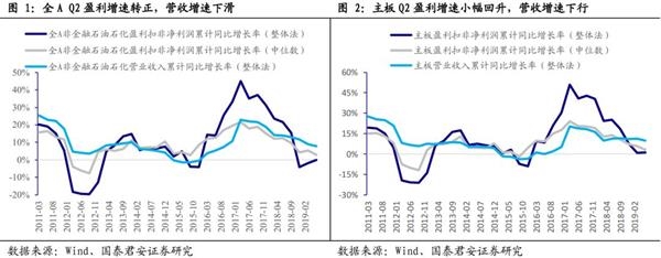 主板Q2盈利增速小幅回升,营收增速下行。从整体盈利表现看,2019年上半年主板非金融石油石化上市公司扣非净利润同比(整体法)增长1.26%,其中Q2单季度同比增长1.64%,增速较Q1环比提升0.81个百分点,全A Q2盈利增速有所回升。以中位数计算,主板非金融石油石化上市公司上半年扣非净利润同比增长3.08%,其中Q2单季度增速为2.13%,增速较Q1下滑3.70个百分点。同样大中市值公司Q2盈利恢复,小市值公司增速下滑。从营收上看,主板非金融石油石化上市公司上半年营收(整体法)同比增长9.71%,Q2同比增长8.36%,增速较Q1下滑2.81个百分点,同样呈现需求不振的特征。