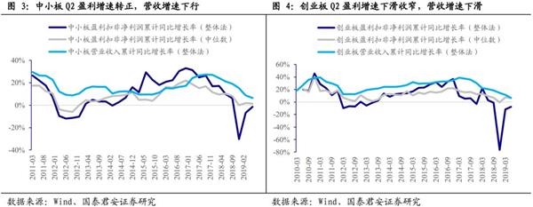 创业板Q2盈利增速下滑收窄,营收增速下滑。从整体盈利表现看,2019年上半年创业板上市公司(剔除)扣非净利润同比(整体法)下滑7.53%,其中Q2单季度同比下滑3.88%,增速较Q1环比提升近8个百分点,创业板上市公司Q2盈利增速下滑明显收窄。以中位数计算创业板上市公司上半年扣非净利润同比增长6.30%,其中Q2单季度增速为5.67%,增速较Q1下滑1.64个百分点。创业板大市值股盈利增速回升明显,但小市值股盈利绝对增速更高。从营收上看,创业板上市公司(剔除)上半年营收(整体法)同比增长6.72%,Q2同比增长2.61%,增速较Q1下滑9.17个百分点。