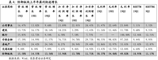防御板块上半年盈利快速增长,盈利能力出色,Q2非银金融、、行业盈利增速较高。我们将、非银金融、、建筑、运输、等盈利受宏观经济影响小或有较强的平滑盈利能力的行业归为防御板块。2019年上半年防御板块营业收入同比(整体法)增长14.55%,Q2增长13.56%,增速较Q1放缓2.02个百分点。防御板块2019年上半年净利润同比增长13.78%,Q2增长11.71%,增幅较Q1放缓4.25个百分点。防御板块上半年末ROEttm环比提升0.22个百分点至11.17%,盈利能力出色。分行业看,Q2非银金融、、行业盈利增速较高,建筑、、交通运输行业盈利增速相对较低,但全部行业实现正增长。