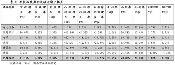 科技板块盈利或接近向上拐点,Q2电力设备、国防军工、计算机行业盈利增速较高。我们将电子、通信、计算机、传媒、电力设备、国防军工等产品具有较高技术含量的行业归为科技板块。2019年上半年科技板块营业收入同比(整体法)增长6.2%,Q2增长2.31%,增速较Q1放缓8.79个百分点。科技板块2019年上半年净利润同比下滑11.49%,Q2下滑11.73%,降幅较Q1扩大0.6个百分点。科技板块Q2毛利率较Q1略有增长,ROEttm下滑至1.6%的低位。考虑到5G将进入快速建设阶段等行业催化因素,科技板块盈利距离向上拐点不远。分行业看,Q2电力设备、国防军工、计算机行业盈利增速相对较高,通信、传媒、电子行业盈利降幅较大。
