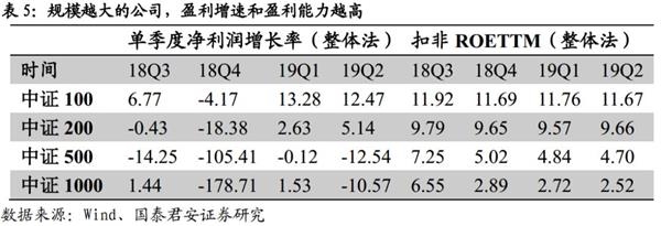 权重股盈利增速更高,盈利韧性更强。我们以成分股无重叠的中证系列指数的盈利表现衡量规模与盈利的关系。2019年Q2单季度,中证100、中证200、中证500、中证1000指数的净利润增长率(整体法)分别为12.47%、5.14%、-12.54%和-10.57%,可见权重股的盈利较中小市值股具有优势。从盈利增速变化看,中证100指数和中证200指数成分股Q2盈利增速环比提升或基本持平,中证500指数和中证1000指数成分股Q2盈利指数环比下滑超过10%。因此权重股的盈利韧性同样更好。