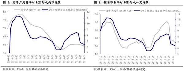 杠杆率上升拉动ROE降幅趋缓。我们用杜邦分析法将ROE拆分成销售净利率、总资产周转率和资产负债率。全A非金融石油石化的资产负债率(最近4期均值)从Q1的61.83%升至Q2的61.96%,总资产周转率TTM从Q1的59.68%降至Q2的59.29%,销售净利率TTM从Q1的5.35%降至Q2的5.23%。历史上销售净利率、总资产增长率与ROE相关性很强,ROE企稳仍需销售净利率和总资产周转率改善。