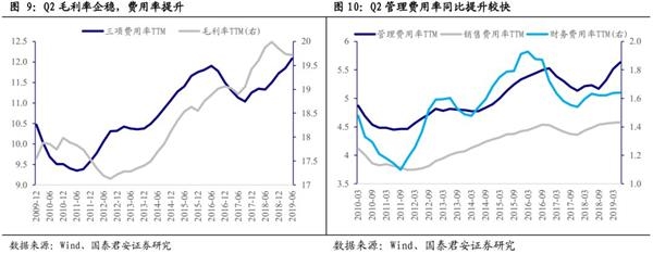 Q2全A非金融石油石化管理费用率提升是期间费用率同比提升的主要原因。2019年Q2管理费用率(含研发费用)TTM环比提升0.22个百分点至5.85%。销售费用率和财务费用率TTM分别为4.59%和1.64%,均基本持平。表明Q2管理费用率同比明显提升是构成期间费用率提升的主要原因。