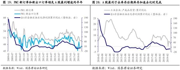 M1增速见底领先盈利增速见底约半年。2010年以来,全A非金融石油石化上市公司净利润增速与M1同比变化有很强的一致性,且M1增速领先盈利增速约2个季度。M1增速于2019年1月见0.4%的底部后回升,从M1与A股盈利关系看,下半年A股盈利增速将见底回升。