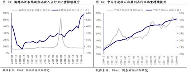水泥行业与的收入占行业比重持续上升。行业集中度的提升不仅局限于消费行业,周期性行业也存在较强的马太效应。我们计算了与2家水泥行业头部公司的营业收入TTM和扣非净利润TTM占A股有近10年季度财务数据的可比水泥公司的比重。2家头部公司的营业收入TTM占行业比重从2010年第三季度的56.19%稳步上升至2019年第二季度的65.32%,而同期扣非净利润TTM占比从61.00%升至78.27%,在行业景气度较低的2015-2016年,2家头部公司扣非净利润占比一度超过100%,表明在行业周期底部除2家头部公司外其余公司总体上呈亏损状态。在行业景气低点过去后,2家头部公司收入占比提升速度加快,表明周期性行业的景气低点是头部公司加速抢占市场份额的机遇期。