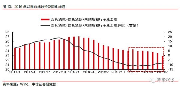 严监管带来的非标融资下滑和企业债券性价比提高是企业信贷不足的两个影响因素。由于企业部门仅有少数龙头企业经营绩效较好(如果我们暂时排除华为这类非上市龙头企业),多数企业的资质下沉就是银行难以放贷的一大因素。而信贷融资之外,金融严监管背景下,表外融资、非标融资承压,宽信用又显得不那么通畅。从同比增速来看,2019年起中国非标融资增速也仅仅表现为底部企稳微增,总量上还有所减少。如果说非标融资是部分资质不足的中小企业融资的一大渠道,那么2019年这部分企业可能就会面临融资困难:借信贷资质不足,借表外受到限制。