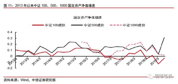从非金融上市企业的规模这一视角看,企业存在“融资资质分化”。上文中的现象拥有一个直观解释:各行业绩优龙头股的经营绩效明显好于其他企业,大盘的上市企业往往是经营良好、实力强劲的行业细分龙头,而其他中小规模上市企业与各大龙头相比经营和资质便有所逊色。具体来看,自2019年来中证100、500、1000指数的财务数据中,仅有中证100、500延续资产负债率上升的态势;2019年第2季度,大盘股中证100的资产负债率已达86.96%;而中证1000的资产负债率仅为54.6%,与去年年末持平。从各指数公司的平均总负债增速来看,中证500所含公司总负债增速即有走平趋势,而中证1000指数所含公司总负债增速自2018年下半年即有下滑态势。这说明,融资分化在上市公司内部早已存在,大、中盘股融资情况显著优于小盘股。