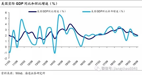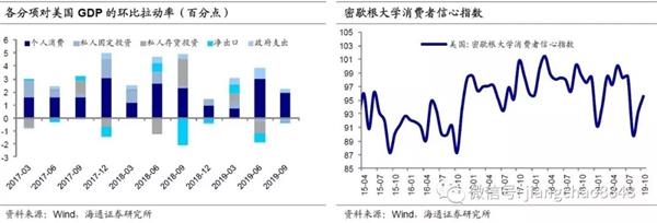 经济小幅放缓。10月会议声明对经济的判断与9月相比没有大的变化,认为近期就业市场数据依然稳固,经济活动增长保持温和,居民消费增长短期较强,而商业固资和疲软的状况仍在持续,经济前景的不确定性依然存在,降息的原因仍是在于全球增长前景的不确定性和美国通胀偏弱。3季度美国经济增速较2季度略有放缓,好于市场预期。3季度美国实际环比折年增速1.9%,较2季度增速小幅下滑0.1个百分点,好于市场预期的1.6%,而实际GDP继续回落到2.0%,是16年以来的新低。
