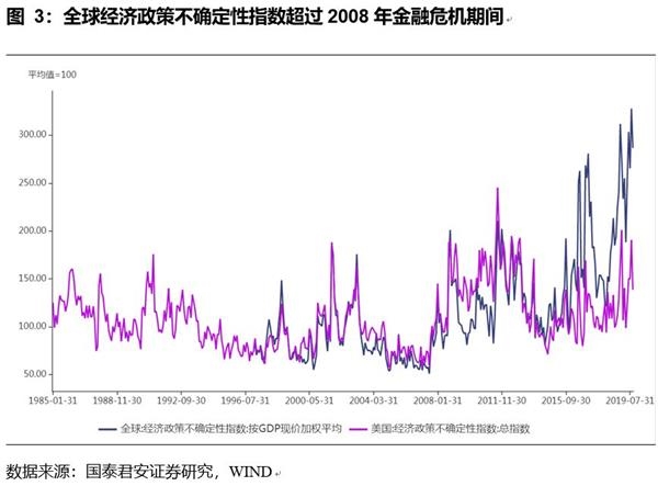 由于全球化陷入停止,法国、智利等国接连发生抗议事件,叠加中美经贸关系的不确定性,全球正处于一种高度不确定性的状态之中。全球经济政策不确定性指数已经超越了2008年金融危机时期。而当前美股已经创出新高,风险偏好依旧较高。对比之下,维持金融市场的稳定,就需要美联储付出更多的努力,将进一步促使美联储的降息。