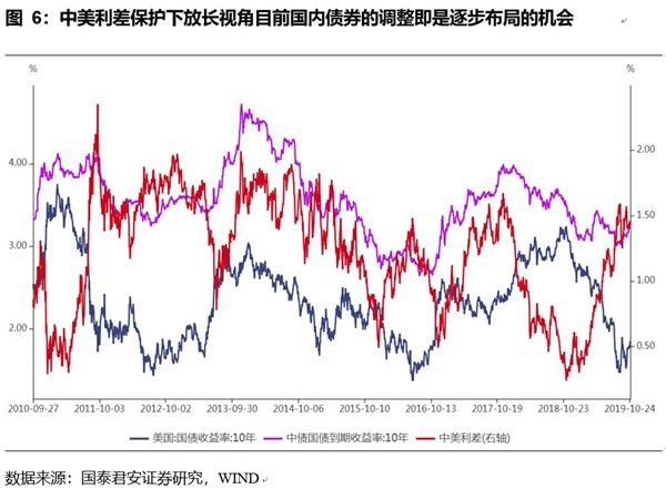国内货币政策短期受到“猪周期”的冲击,通胀压力较大,短期不会跟随,国内政策仍以结构性政策为主。预计2020年1季度后通胀压力将逐步消退,政策空间有望打开。在中美利差的保护下,在经过近期债券收益率的调整后,预期2020年依旧有一波债券收益率下行的机会。在考核机制及博弈思维下,启动时间甚至可能在1季度。