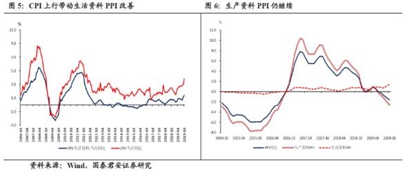 温和假设:假设11月猪肉价格回落至10月全月的平均水平,2020年1月因春节效应,猪肉价格上涨5%;其他月份符合季节性波动,则11月CPI或达4.1%,2020年1月CPI或达4.6%。