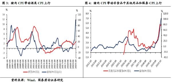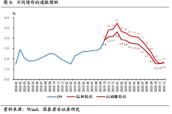 (2)胀假设:假设11月猪价维持在56元/千克;在2020年1月因春节效应,猪肉价格上涨5.6%达60元/千克;其他月份符合季节性波动,则11月CPI或突破4.5%,2020年1月CPI或达5.5%。