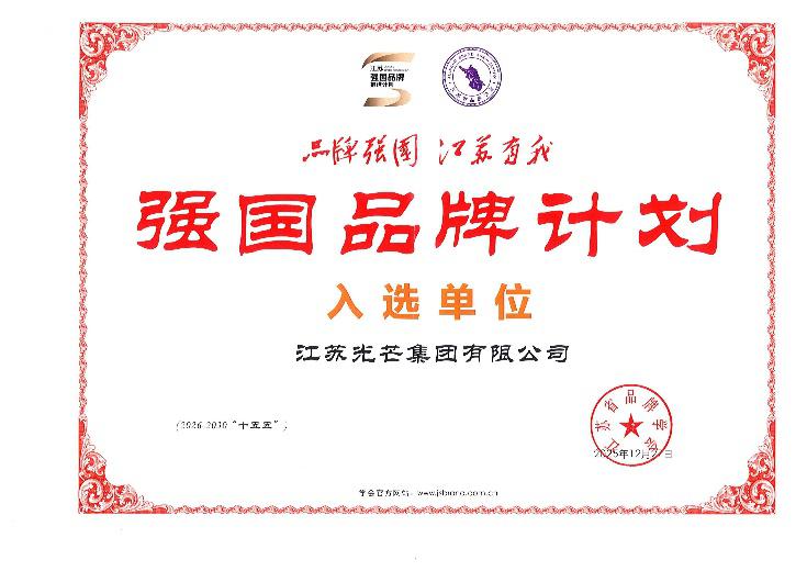 2025年12月27日,“2025江苏品牌创新发展大会暨强国品牌计划启动仪式”在江苏隆重举行。会上,光芒集团成功入选“‘十五五’·强国品牌计划(2026-2030)”首批知名品牌企业,并获颁荣誉奖牌。