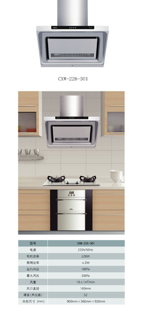 据光芒集团油烟机技术部总工程师叶麒麟介绍,近吸式cxw301油烟机采用了流线型整体不锈钢面板成型技术,表面进行特殊油墨拉丝处理,不粘油渍,易于清洗。其中,三级进风,三重吸烟采用了一级近吸,二级双拉伸烟腔,吸进缓存油烟,三级彻底吸净油烟。在增加了人体感应控制系统和大容积油槽的同时,cxw301近吸式油烟机的吸油烟率依靠“V漩涡整流冷凝腔”滤油技术,使得油脂分离度达90%,气味降低度达95%以上,符合国家节能产品的一级标准。让“不要油烟味,只要女人味”成为现实。发动机的大尺寸叶轮,结合阿基米德螺旋风道的原理,在提升系统整体分离能力的同时,吸力强劲、噪音更低。
