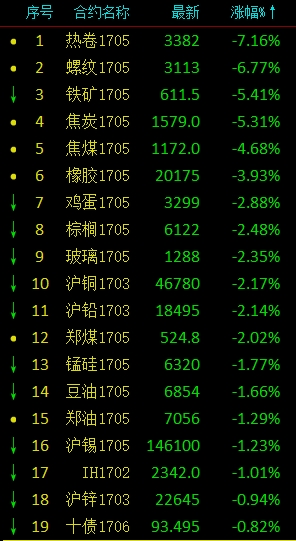 黑色系跌幅最为显著,热卷跌超7%,螺纹钢跌近7%,盘初一度触及跌停,焦煤、焦炭、铁矿石收跌超5%。整体跌幅在2%左右,铜下跌2.17%。