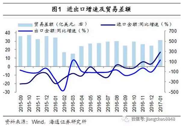 根据海关总署的统计,美元计价下,我国1月进口总额同比增加7.9%,出口同比增速扩大到16.7%。1月贸易顺差513.5亿美元,较16年12月大幅增加。我们的观点是:外贸远超预期,汇率短期稳定。