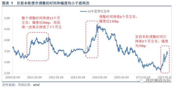 1、目前本轮债市调整的时间和幅度均小于前两次