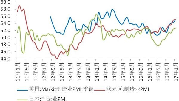 外需的改善快于预期。美国在去年四季度全面好转(图1),同时,美国也处在加库存周期(图2)。全球主要经济体制造业纷纷创新高,其中美国创2年来新高,欧元区创5年半新高,日本连续5个月保持在50以上(图3),2017年全球经济可能在美国的带动下增速加快,有利于外需的回暖。