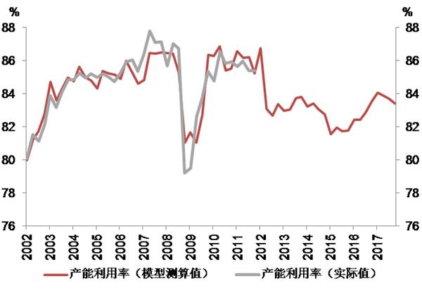 我们测算当前中国工业平均产能利用率或回升至80%左右,若是中央进一步推进去产能改革,产能利用率有望继续回升,有助于周期行业出清。目前,我国除了统计局或行业协会零星发布过平均产能利用率,尚未有正式发布的平均产能利用率的统计。OECD曾在2002-2011年期间发布过中国平均产能利用率,那时平均水平为85%左右,但是后来就中断发布了。我们利用这个历史数据序列作为因变量,并把工业生产增加值和PPI作为自变量,在滑动平均模型(MA(1))并兼有时间趋势的情况下,对历史数据进行拟合。拟合的效果相当好(图10)。利用这个模型,我们把OECD的时间序列向前拟合,得到最近的平均工业产能利用率84%左右。我们把我们测算的产能利用率和统计局零星公布的数据进行对比,发现这一数据平均高出4个百分点左右。所以,我们估算当前的平均工业产能利用率应该在80%左右。