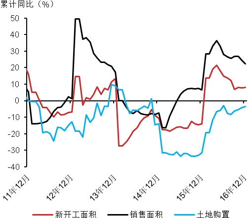 地产调控预示房地产投资增速大概率下行,但房地产市场领先指标显示短期房地产投资仍可能平稳,回调时间或在二季度中,预计全年增速在2-3%的水平。2016年四季度或者11-12月份的土地购置面积、新开工面积数据同比增速上行,先期指标预示地产投资稳定(图8)。其中,新开工面积分季度的同比增速分别为18%、14%、-2.7%和12%,四季度明显快于三季度,且12月的环比为近5年来最快增速,绝对量仅次于2010年12月;土地购置在2016年最后两个月也处于2016年全年相对较高的增速,且并非由于基数而是绝对量的增加,累计增速连续4个月上行。