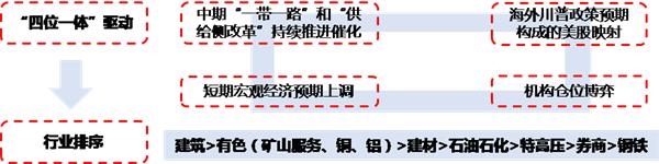 站在当下,我们认为,春季旺季延续、需求无法证伪的背景下,周期品行情仍在中途。短期预期上调放大春季旺季弹性,“一带一路”和“供给侧改革”落地提供中期牵引,海外川普政策预期构成美股映射,加之机构仓位博弈仍有空间,国内周期品正迎来“四位一体”驱动的中段行情。基于以上四重催化因素的受益程度,以及国泰君安行业研究员自下而上的脉络梳理,当下时点周期品建议推荐排序为:建筑>有色(矿山服务、铜、铝)>建材>石油石化>特高压>券商(机构博弈角度,传统高弹性板块的弯道超车机会)>钢铁。
