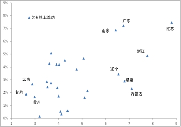 纵轴:新增大专以上学历人口在全国的占比横轴:人均GDP