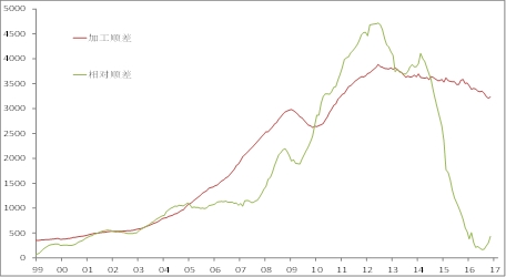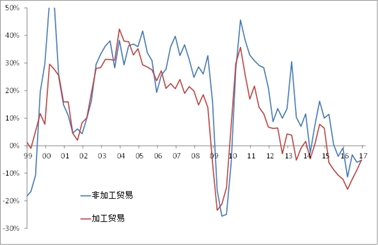 外部环境对于我国经济的影响主要体现在出口方面,今年中国的出口不容乐观。近两年来中国的出口都是负增长,且2016年中国出口在全球出口份额的占比首次出现了下降。从出口的明细项看,2016年出口降幅高达7.7%,虽然第四季度降幅收窄至5.2%;加工贸易的降幅继续扩大,2016年降幅达到10.2%(2015年下降9.6%);而非加工贸易2016年降幅达到6.4%,相对于2015年1.1%的正增长,更需关注。