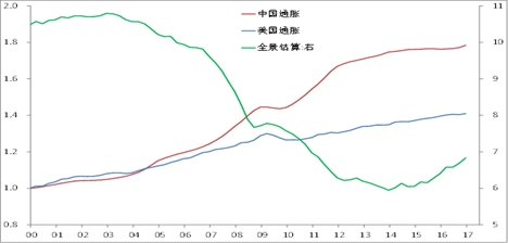 2017年,欧美日经济均处于复苏之中,这对中国借助外需是有利的。其中,美国的情形相对最好,2010年以来一直保持同比正增长;而欧元区在2011-2013年曾经历衰退;日本则几经反复,最近的这次持续正增长始于2015年。IMF预测欧元区、日本今年的GDP增速分别是1.6%、0.8%,与去年的1.7%、0.9%增速大致相当。