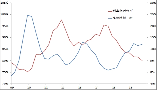 例如,不少人认为央行调整基准利率会对房价带来影响,从逻辑上是可以这样解释,但通过相关性分析,却发现导致房价波动的最大因素并不是基准利率调整。数据表明,房地产政策对房价的影响十分明显,根据“金融机构贷款加权利率”,计算“个人住房贷款”与“一般贷款”之间的相对水平,可以解释房价的每一次拐点(2008年末才开始有相关数据)的出现都与政策出台有关——这正是房价对政策变化的充分反应:“利率相对水平”提升背后反映了政策收紧,表明房贷利率打折幅度缩减,二套房不予支持、外地户籍限购等一揽子调控政策开始升级。