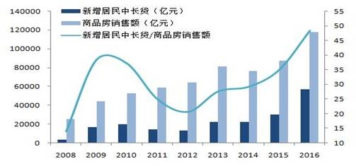 此外,需要引起重视的是,这两年居民购房杠杆率水平明显上升,也就是过去买房的主要是高收入群体,如今中等收入群体的购房比例开始上升了。如2016年居民中长期贷款占商品销售额的比重已经接近50%。