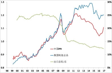 当前社会普遍对通胀预期较高,我们对通胀的预测需要从价格形成体系和传导机制入手进行分析。下图表明中美之间的裂口是在2012年发生的,之前它的波动非常一致,裂口出现的原因就是中国出现了产能过剩和需求下降。