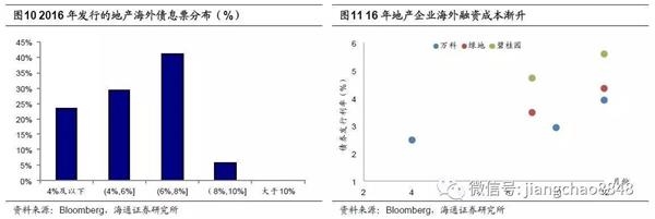 从微观层面来看,2016年内发债利率上行。万科在16年发行过3期票据,分别是4月发行的3年期港元票据,息票为2.5%;9月发行的5年期美元票据,息票为2.95%;12月发行的3年期美元票据,息票为3.95%,这三期票据的发行成本一期比一期高,可以看做是海外融资成本上升的写照。绿地在2016年发行过2期票据,分别是9月发行的3年期美元票据,息票为3.5%;12月发行的3年期美元票据,息票为4.38%,在同样期限下成本上升较为明显。碧桂园在2016年也发行过2期公司债,分别是9月发行的7年期美元债券,息票为4.75%;12月发行的10年期美元债券,息票为5.63%,均反映出海外发债成本上升的态势。