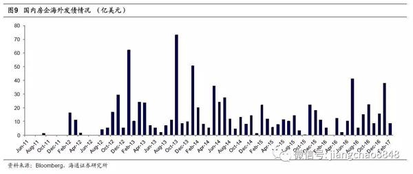 2.地产企业海外发债升温。17年以来内地房企共成功发行海外债券13只,累计金额达到46.4亿美元,较15年1-2月总额还要多出一倍。上一波地产调控后海外发债也出现过激增,同比增加超过1倍。从融资成本来看,16年海外地产债平均票息低于15年,但随着人民币贬值+美元进入加息周期,海外发债成本开始反弹,万科、绿地、16年年内发行的几只票据息票均有抬升。在人民币贬值压力仍大、融资成本上行的背景下,地产企业仍选择海外融资,主要还是受国内融资收紧的驱动。