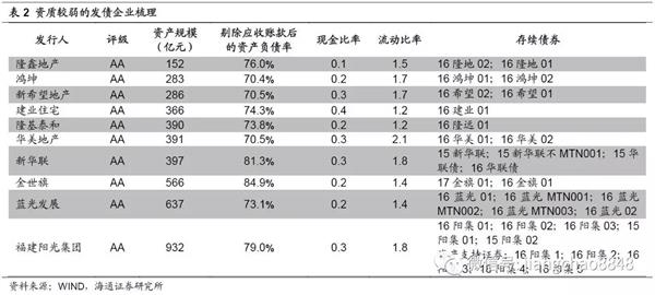 目前存量地产债规模超过2万亿元,2018、2019年将分别有5000亿元左右的存量债到期,到期压力集中。海外债券到期压力也逐渐增多,未来3年待偿债券超过350亿美元。前期融资产生的大量债务逐渐到期,国内融资何时放松尚不可知的背景下,房地产务偿还问题将逐渐浮出水面,个体信用基本面将因融资能力和抗风险能力的差异而加剧分化,应警惕弱资质地产企业违约风险的爆发。我们筛选出财务指标较差的发行人供投资者参考。