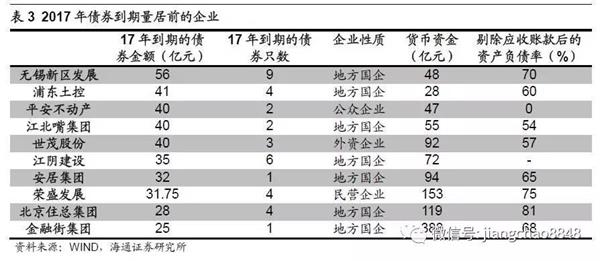 此外,在17年有债券到期的企业有接近百家,到期量前十的企业分别是无锡新区发展(56亿)、浦东土控(41亿)、平安不动产(40亿)、江北嘴集团(40亿)、(40亿)、江阴建设(35亿)、安居集团(32亿)、(31.75亿)、北京住总集团(28亿)、集团(25亿),其中除了荣盛发展、北京住总提图案、金融街集团现金储备较充裕外,其他企业均需关注。