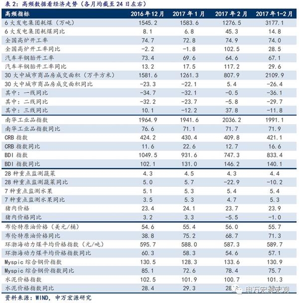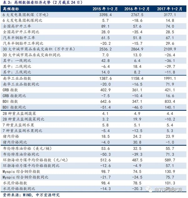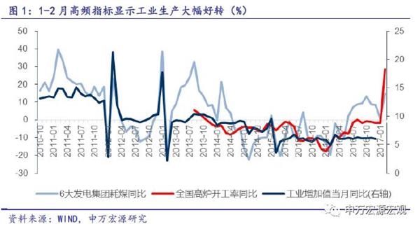 一方面,2016年1-2月的工业生产较弱,工业增加值仅增长5.4%;另一方面,去年四季度以来的小周期复苏仍在延续。预计2017年开年工业生产较为强劲。从高频数据来看,1-2月合计的电厂发电耗煤增速高达14.8%,大幅高于2016年12月的8.1%和2016年1-2月的-18.6%。尽管受到限产和去产能等的影响,但1-2月合计的高炉开工率同比增速仍高达28.5%,远高于16年12月的-2.2%。半钢胎开工率同比也高增29.6%,较16年12月的13.2%大幅回升。