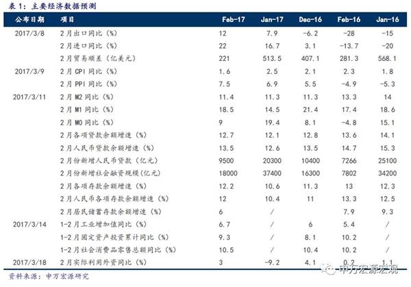 增长或超预期,关注两会定调。预计1-2月工业生产、投资、社零分别增长6.7%、9.3%和10.5%。预计2月和分别上涨1.6%和7.5%,分别增长22%和12%,顺差221亿美元。信贷投放9500亿元,新增社融1.8万亿元,M2增长11.4%,M1增长18.5%。两会即将召开,如何稳如何进值得重点关注。稳体现在:稳增长、财政政策积极有效、货币政策稳健中性、去金融领域杠杆。进体现在:深入推进供给侧改革、、和京津冀。预计2017年政府工作报告设定的经济目标为:增长6.5%;CPI增长3%,持平于2016年;赤字率维持3%-3.5%;M2和社融增长12%,较16年下调1个百分点;新增就业1000万人以上。