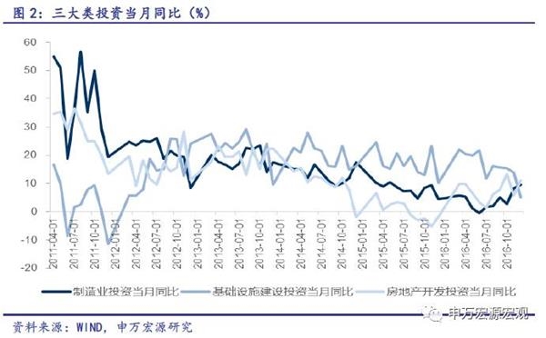 从近几个月的投资增速来看,制造业投资受益于PPI上涨带动实际下行和企业盈利回升,持续改善。地产投资也受到前期销售的滞后影响,仍然在高位运行。但16年下半年基建投资受到财政支出限制,显著回落。目前来看,PPI仍在上升通道,制造业投资的改善之势仍有望延续。地产投资短期内表现尚可,1-2月100城商品房土地成交增长33.8%,而16年12月为下跌27.1%,大幅回升。基建项目有望年初加快推进,基建投资或将明显反弹。预计1-2月投资增速较16年底显著回升至9.3%。