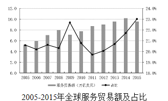 服务贸易占比持续提高。2015年,服务贸易占全球贸易的比重为23%左右。若按附加值计算,服务贸易占全球贸易的比重已达到50%左右。2011-2015年,服务贸易规模由8.7万亿美元增加到9.6万亿美元,提高了10%,是2008年金融危机前规模的1.4倍;2015年,服务贸易占全球贸易总额的比重达到23%,比2011年提高了3.3个百分点。